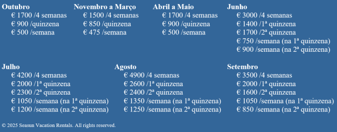 Os preços indicados são por apartamento e período de arrendamento (p.f. ler regras de ocupação máxima em baixo). Nós não fazemos arrendamentos de 1 noite, mas arrendamos noites extras consecutivas (quando disponível) pro rata com base no pacote de arrendamento comprado.